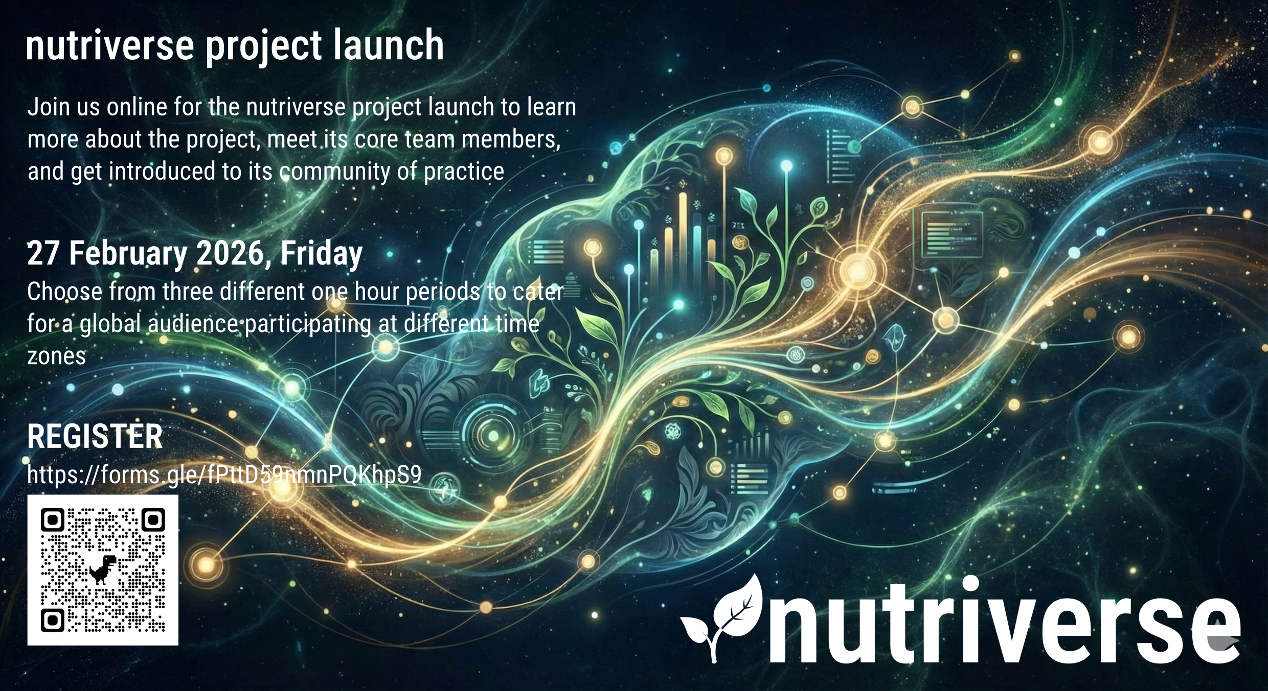The nutriverse project launch will be online in a webinar format and held at three different one hour periods on the 27th of February 2026 to cater for a global audience participating at different time zones.